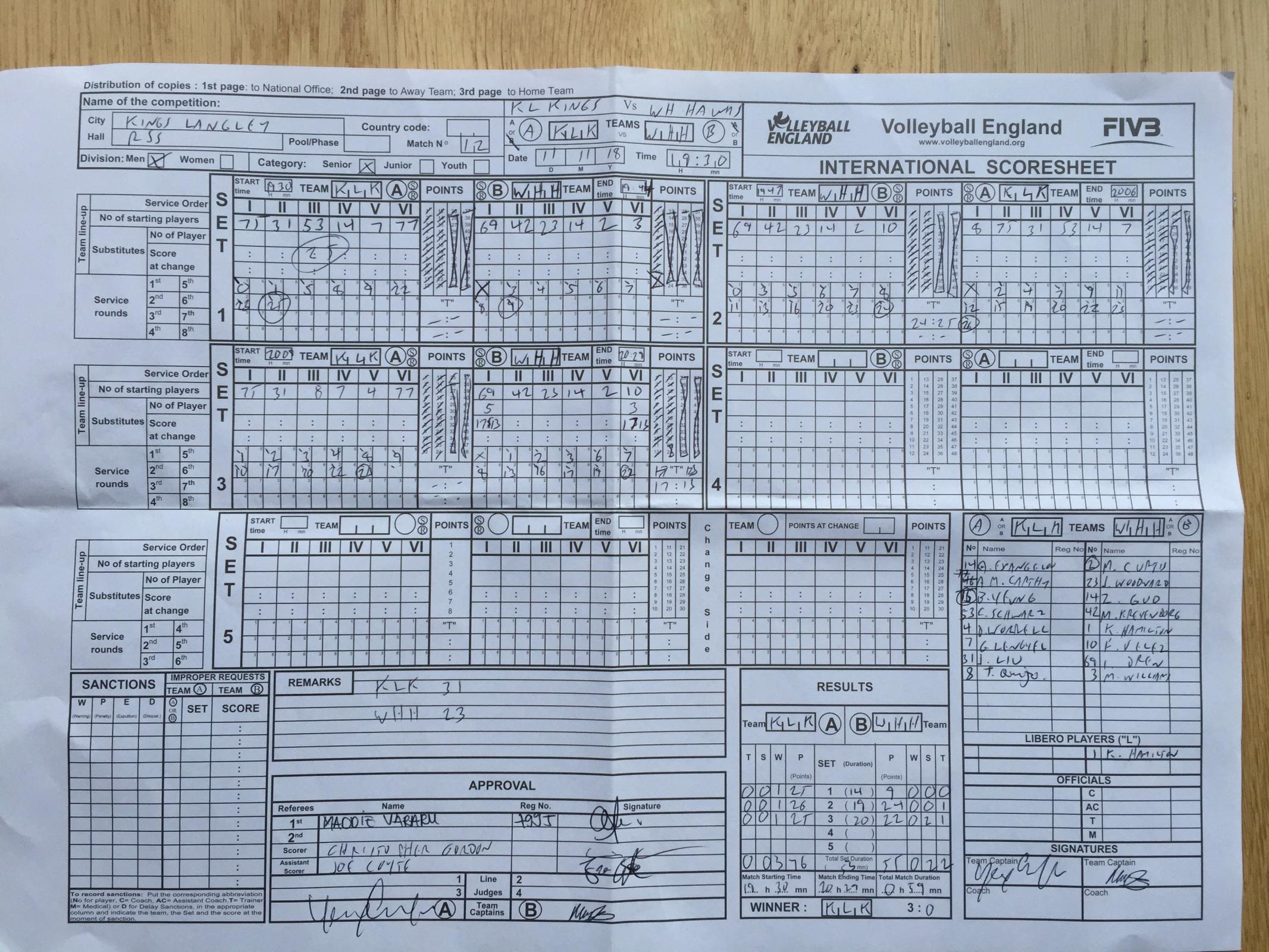 Note that "R. Velarde" was not recorded on the scoresheet roster, but was apparently the player subbed in the 3rd set with shirt 5. I've added them to the online recording of the result after discussion with Lynne Howitt at WHVC and the scorers. Scorers said that WHVC captain did inform them that another player was due and that they would introduce themselves on arrival, but they never did.