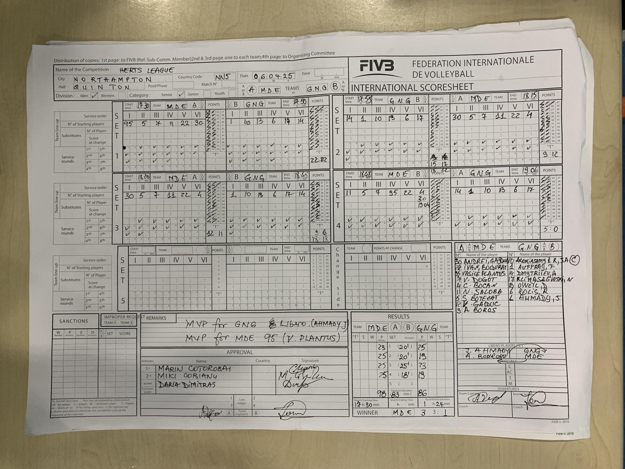 I think MDE Lib "A. Bourossa" is the same player as #9 A Boros. Number 9 didn't play as a rotation player so fine. Libero for GNG also on both sections of roster. Set 4 completed with teams the wrong way around. Results section incomplete. Poorly completed scoresheet