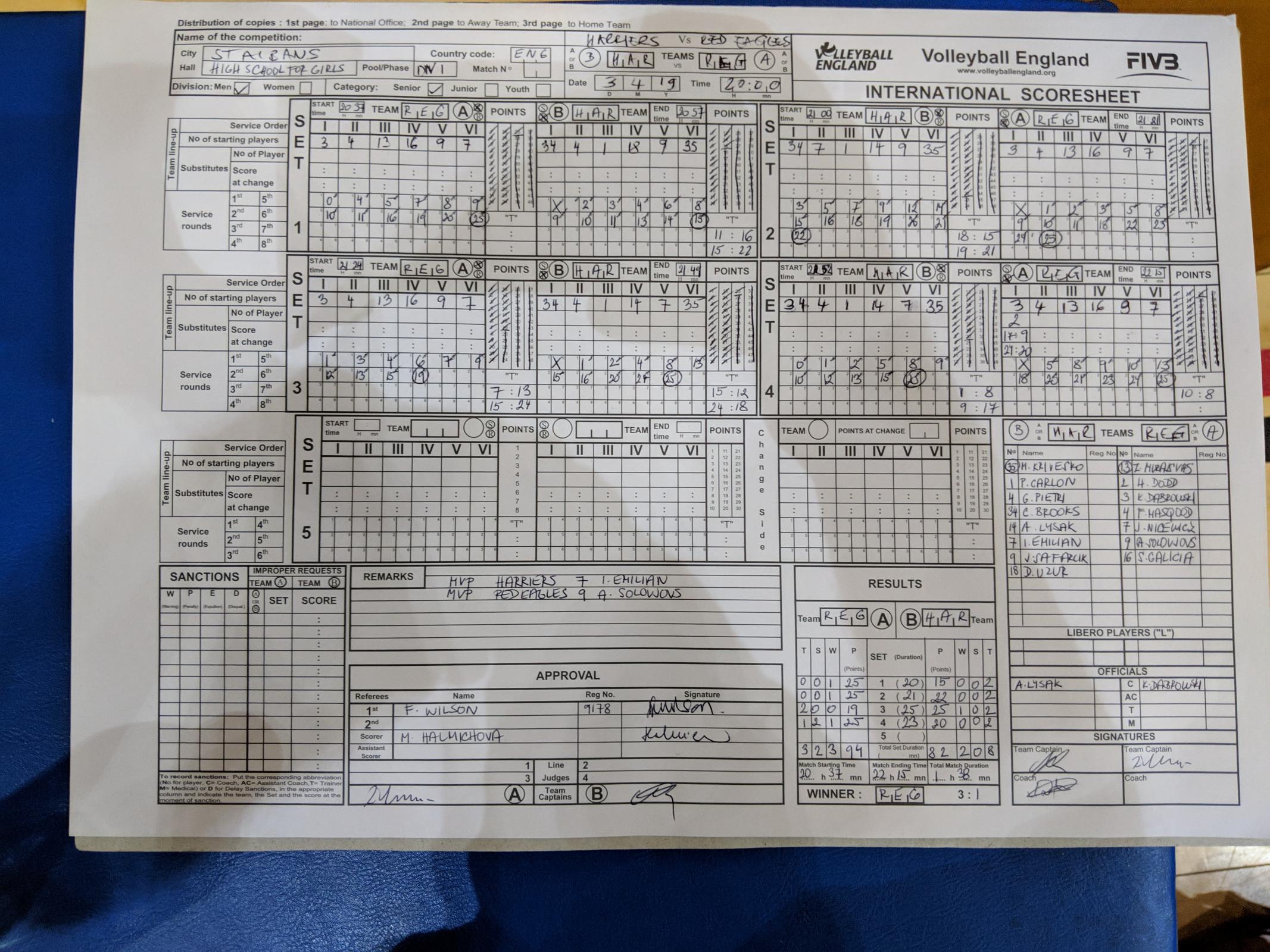 Red Eagles fielded an ineligible player combination in the 4th set when they had player 7 (J. Nicewicz) and 16 (S. Galicia) already on the court who were then joined by player 2 (H. Dodd) by substitution for a few points. Player 2 was later re-substituted with the original player. The three players noted are registered to Red Eagles M2 team and it means Red Eagles M1 did not have 4 players on the court as required by the HVA rules. Red Eagles acknowledged this was a mistake on their part. The HVA rules state that Red Eagles should forfeit the match, but in the circumstances (the player disadvantaged Red Eagles) and with the agreement of Harriers, Red Eagles will instead forfeit just that set.