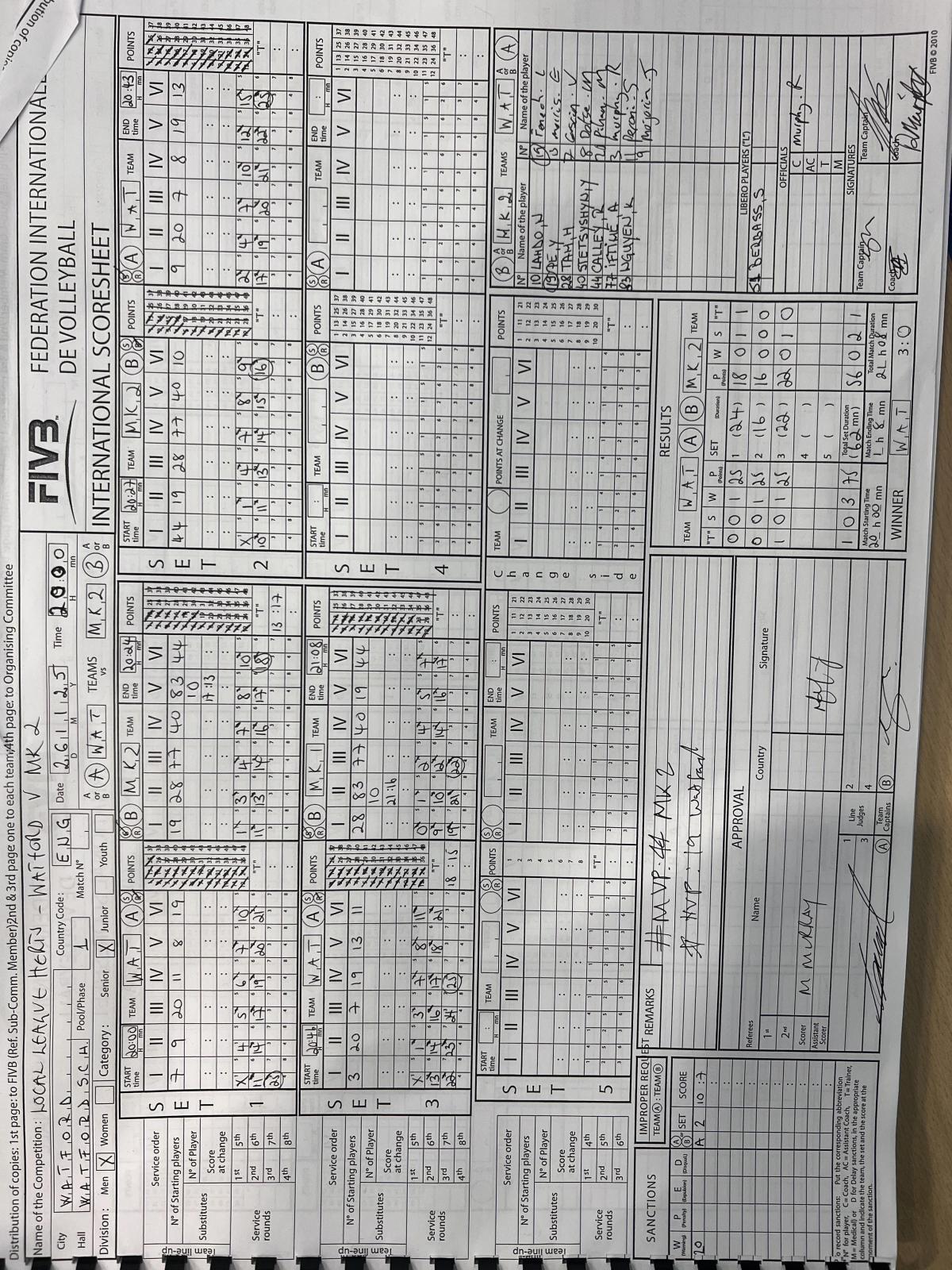 Fine £5 for incompleted scoresheet missing the name and signature of Ref 1 and 2