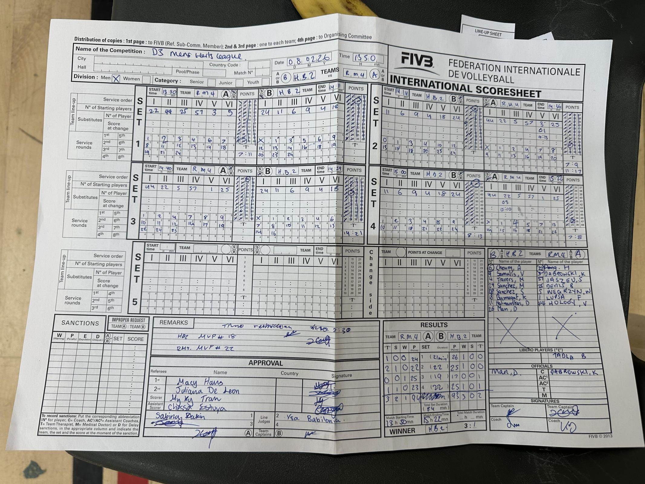 4th Set: RE played with 3 core players when subsidised Player 22 (Dong, H) for player 3 (Dabrowski K) , therefore forfeit the set.