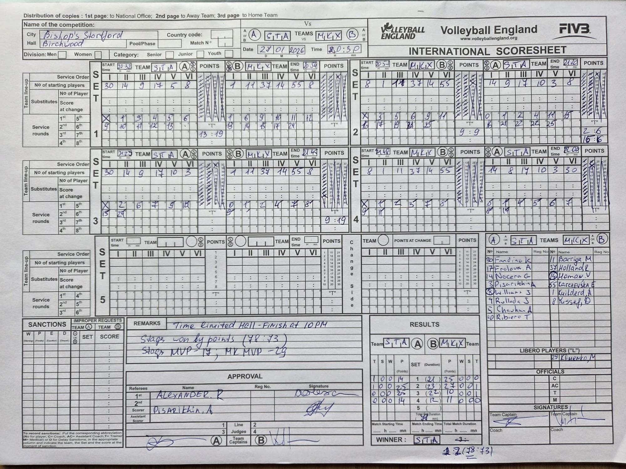 MK City playing with 3 core players instead of 4. Means that all sets are null and 3-0 for stags (25-0) instead of
